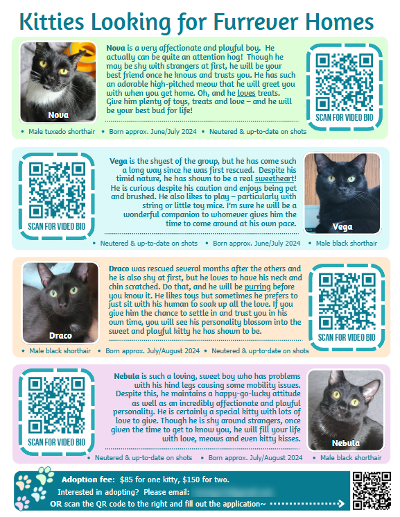 I also used this as an opportunity to test out adding QR codes to the flyer for both the video bios and the application form that potential adopters can fill out. As I learn new skills, I enjoy being able to utilize what I've learned in different ways~